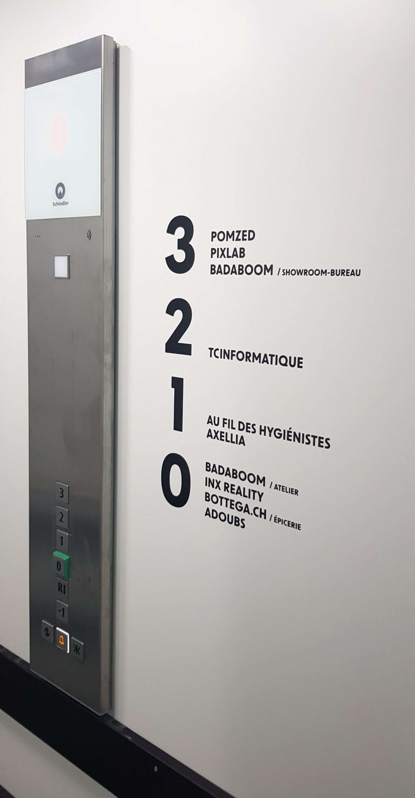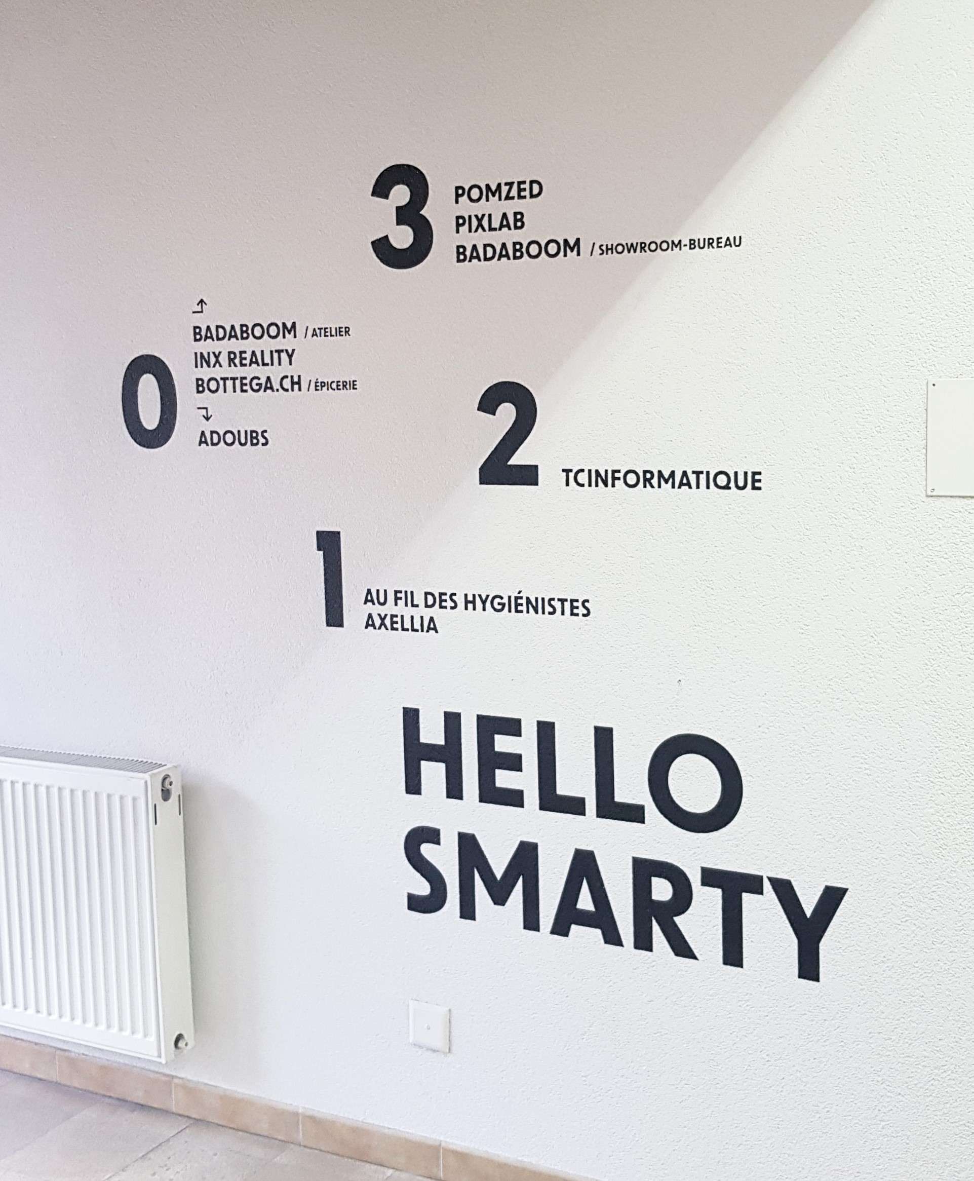 Signalétique de bâtiment pour l’usine Smarty à Delémont, en collaboration avec nos partenaires Pomzed Communication.